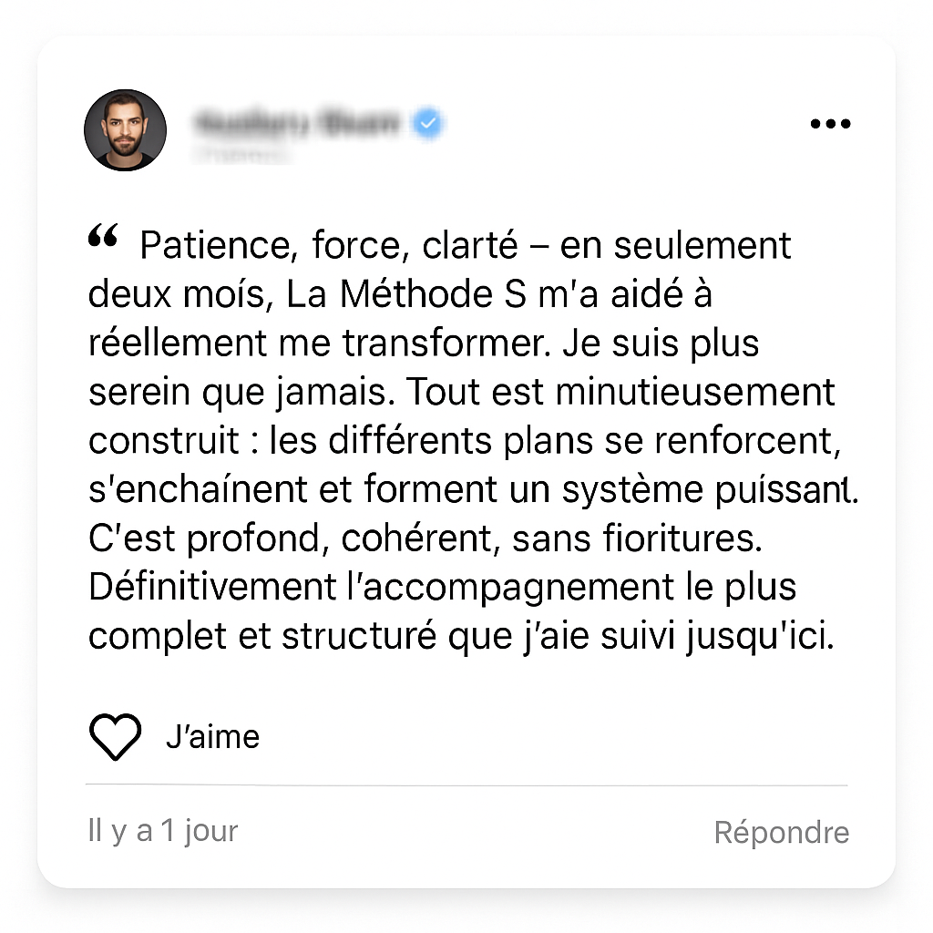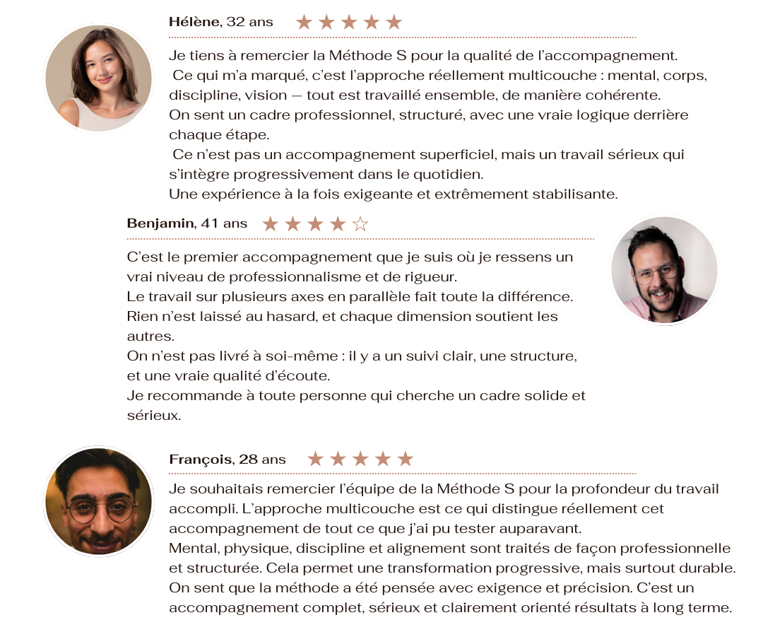 La Méthode S, ne cherche pas à te convaincre. Elle t'apporte un cadre clair, un plan structuré et un accompagnement professionnel assuré par des référents qui te guident step by step.